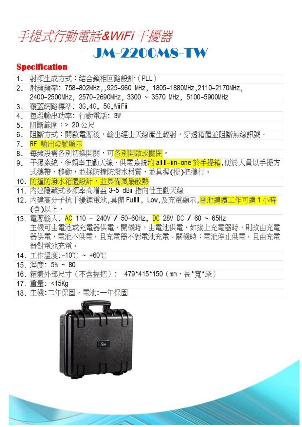 JM-2200M8-TW行動電話訊號阻斷遮蔽器,設計適用於戶外訊號阻斷遮蔽,方便攜帶使用