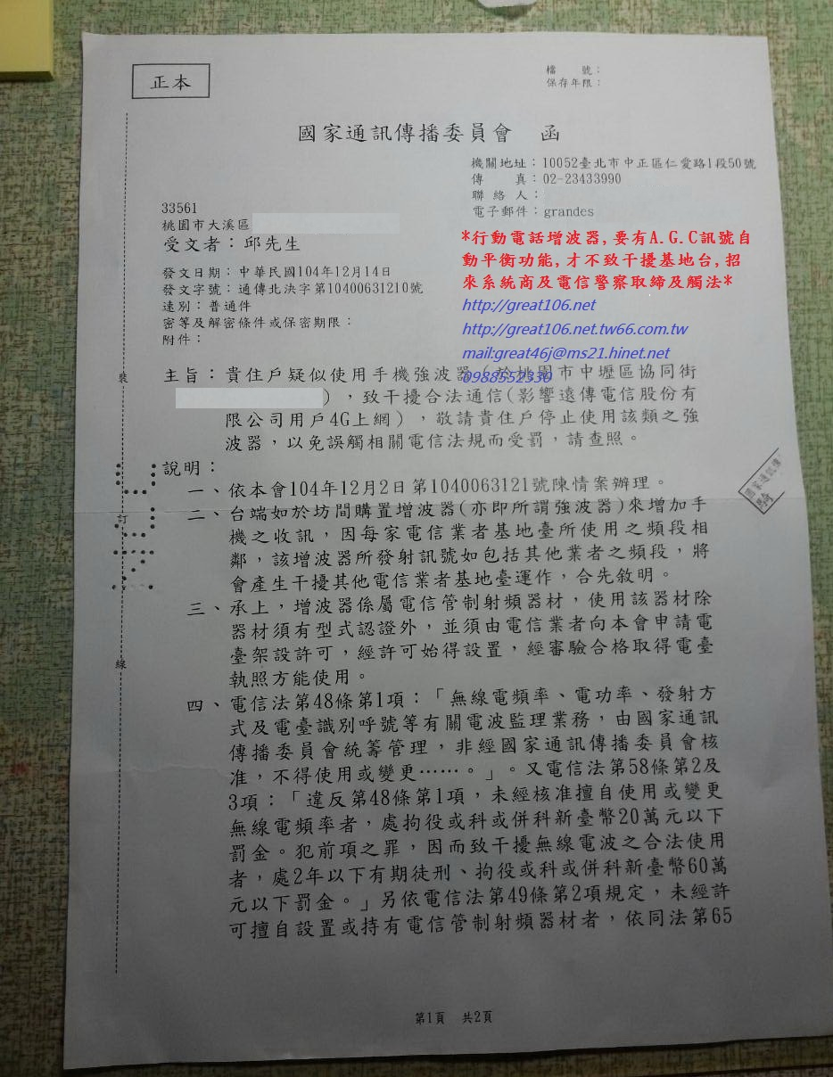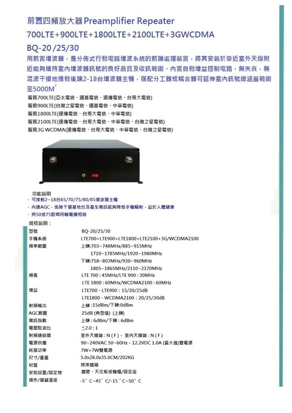 為何要有A.G.C.功能.就是訊號自動平衡功能.不會干擾基地台.雙色LED指示燈.啟動A.G.C.不致招來NCC.系統商.電信警察取締.台灣合格工廠製造.保固期間2年.3G 4G行動電話增波器.架設室外天線位置.按裝需知.才不會干擾基地台,干擾系統商.NCC取締.3G WCDMA 4G LTE 700MHz .900MHz 1800MHz. 2100MHz .2600MHz.訊號5格:≧-77dBm.訊號4格:-78~-84dBm.訊號3格:-85~-91dBm.訊號2格:-92~-98dBm.訊號1格:-99~-105dBm.訊號0格:-106dBm.按裝地點何種頻段LTE-700/LTE-900/LTE-1800(4G)-WCDMA UMTS (3G) LTE 4G強波器?按裝地點何種頻段有?dBm值.廠商用儀器測屋外何種頻段有?dBm值.各家電信公司NCC分配頻率不同.非網路上廉價強波器購買便可.網路上使用面積坪數.非絕對值.應取決於室外訊號dBm值及使用線材使用線材發射及接收頻率**架設**規劃** .昔時使用2G/900MHz/GSM.1800MHz/DCS大哥大強波器.行動電話強波器.行動電話增波器因NCC分配各家電信業者頻率.頻寬.目前己產生干擾現在4G LTE 4G/900 4G/1800.網路上廉價大陸貨.無維修能力.近來己發生多件干擾事宜.徒增困擾及無奈.唯有銷售有品牌有經驗及能力修改.昔時2G/900MHz/GSM.1800MHz/DCS行動電話強波器.行動電話增波器符合4G LTE 900/1800.現行系統商使用NCC分配各家電信業者頻率.頻寬.不干擾現在4G LTE 4G/900 4G/1800.目前純4GLTE只有700頻段直接跳過2G、3G時代,代表業者為新亞太.遠傳.台哥大.但新亞太亦用VoLTE(4G通話技術)當通話(與2G、3G的通話技術不同)A.900、1800均為2G時代之系統,無3G上網、通話,直接跳4G,但目前只有支援4G上網且保留2G通話功能B.900:台灣之星(4G),中華(2G+4G),遠傳/台哥大(2G),國碁(未開通)C.1800:台哥大(2G+4G),中華(2G+4G),遠傳(2G+4G).3G:實為1900+2100(簡稱19對21或21),為3G通話+3G上網有遠傳、台灣之星(原威寶)、台哥大、中華四家市面上宣稱的4G+3G實為1800+2100因為老三台(台哥大、中華、遠傳)用這兩個頻段即可支援,注意這並非真全頻(4頻4G+3G+2G)注意同行對手可能利用此點呼攏業者,一定要告知業者.