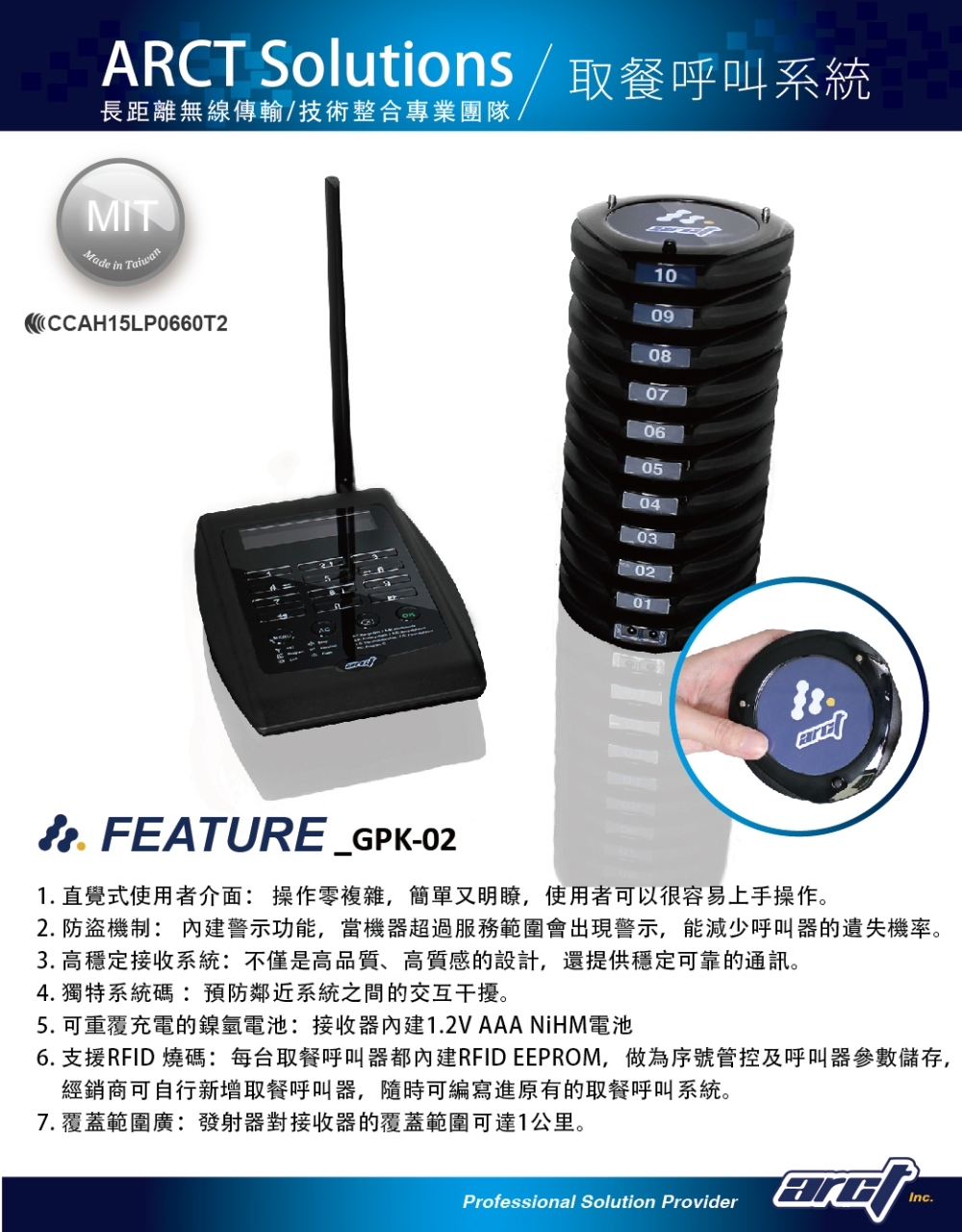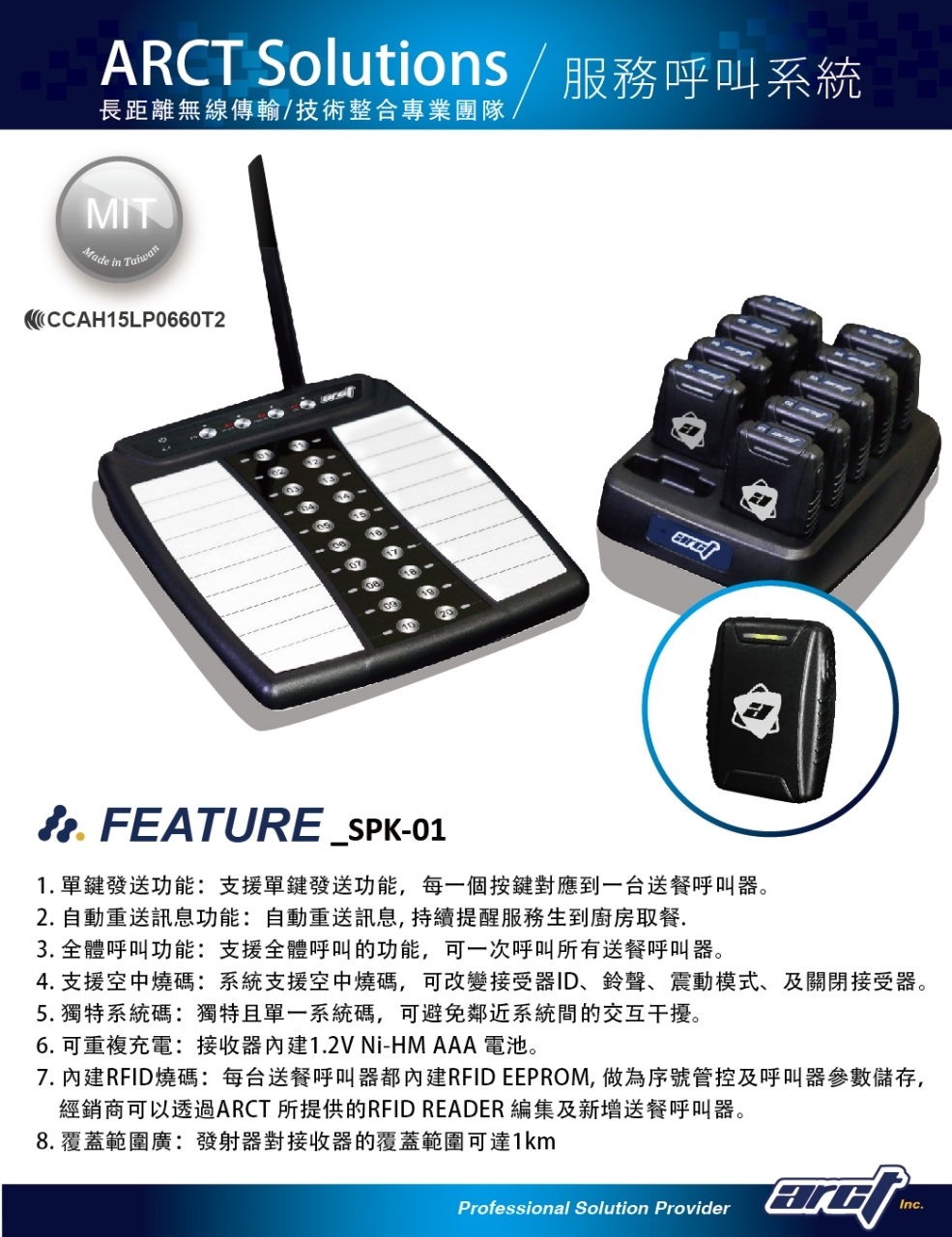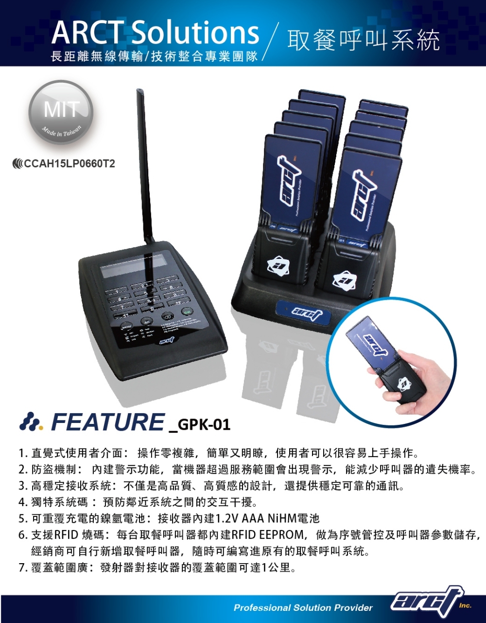 LEDs.>內建警示功能超出範圍*無電*.紅燈閃爍.為被呼叫中.4.本機可事先燒碼輸入RFID EEPROM號碼.支援空中燒碼